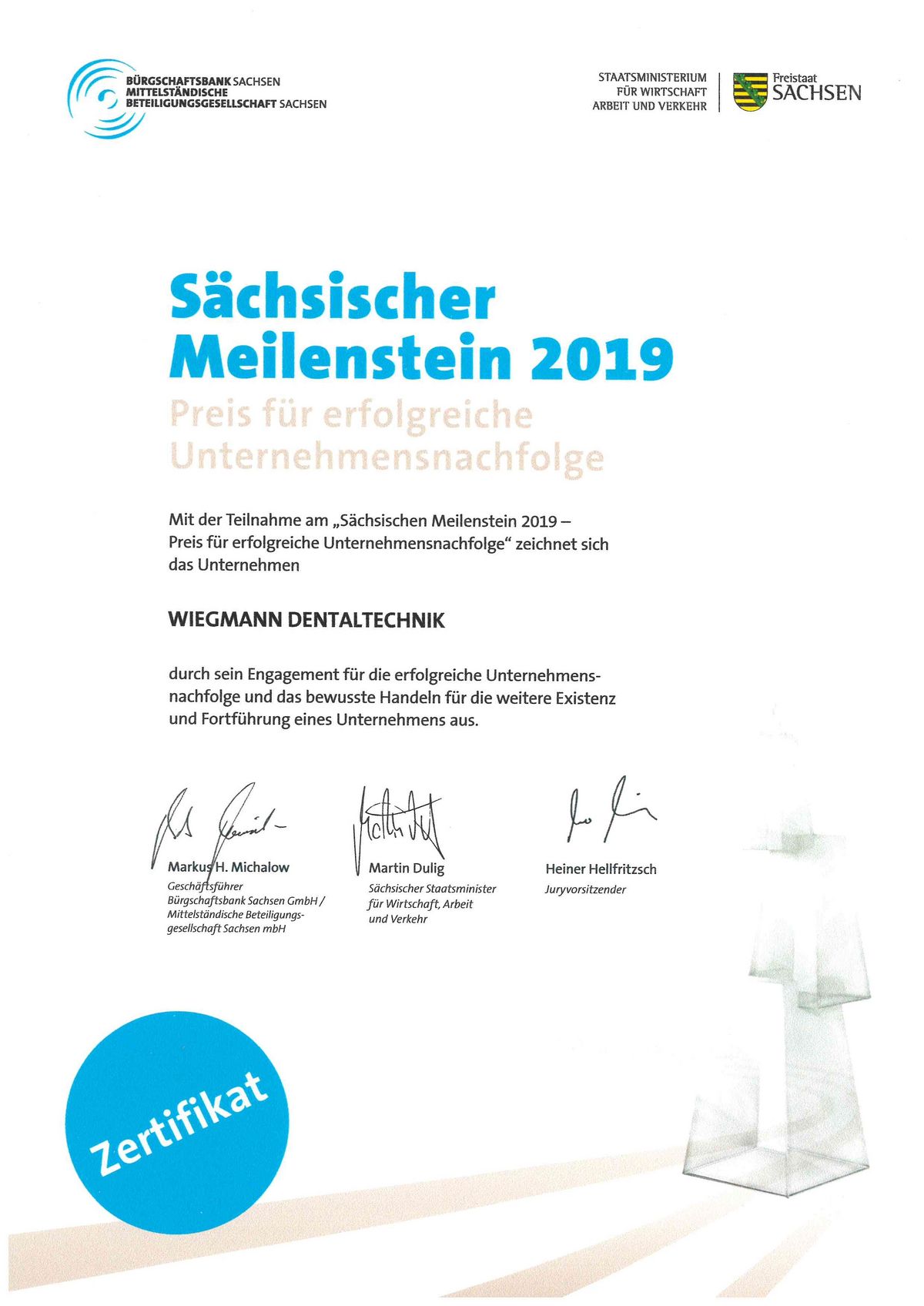 Seit 2011 zeichnet die Bürgschaftsbank Sachsen GmbH zusammen mit der Mittelständischen Beteiligungsgesellschaft Sachsen mbH und unter der Schirmherrschaft des Sächsischen Staatsministeriums für Wirtschaft, Arbeit und Verkehr erfolgreich umgesetzte Übernahmekonzepte mit dem Sächsischen Meilenstein aus.